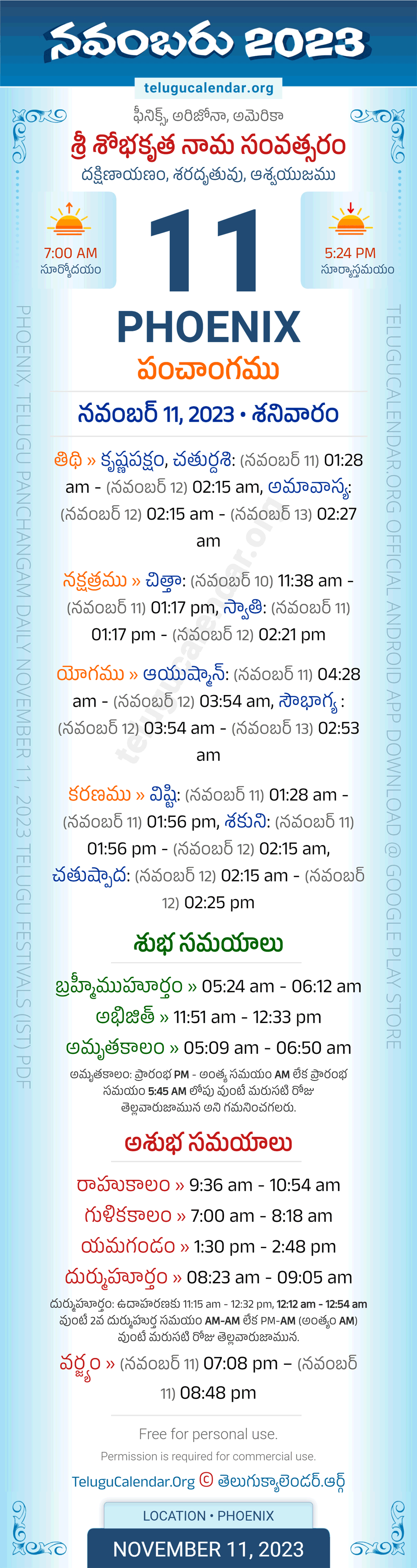 Download » November 11, 2023 » Phoenix (USA) Telugu Panchangam Daily Sheet with Auspicious and Inauspicious Timings.