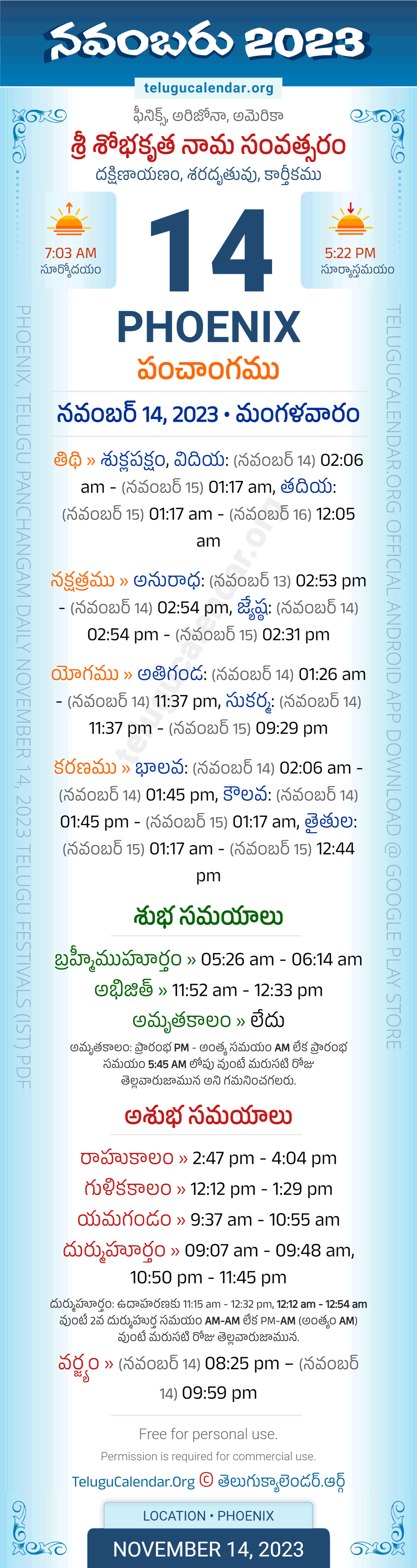 Download » November 14, 2023 » Phoenix (USA) Telugu Panchangam Daily Sheet with Auspicious and Inauspicious Timings.