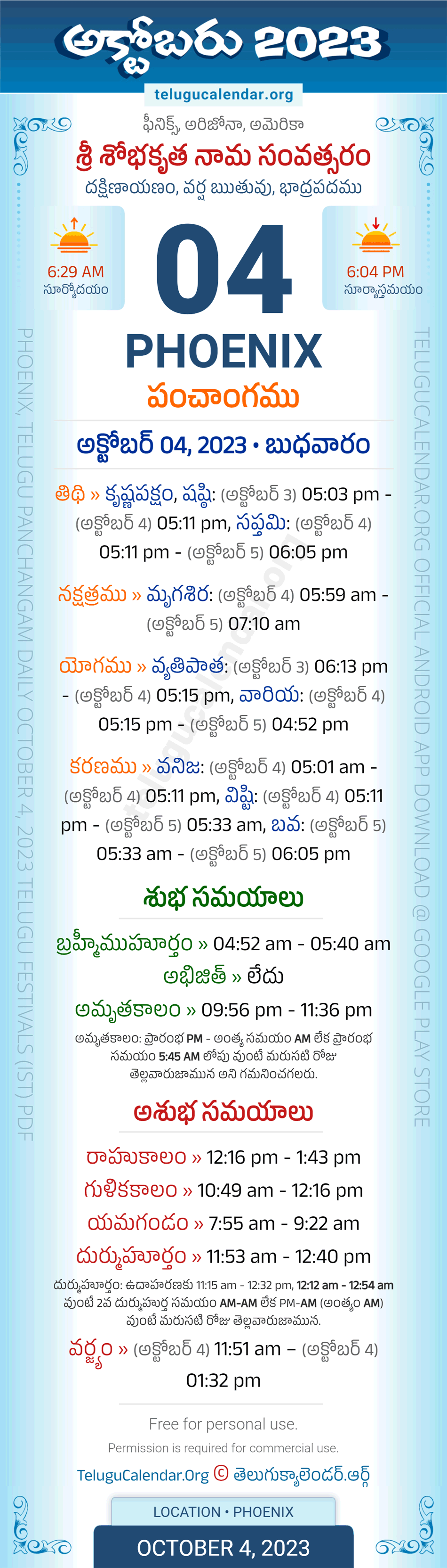Download » October 4, 2023 » Phoenix (USA) Telugu Panchangam Daily Sheet with Auspicious and Inauspicious Timings.