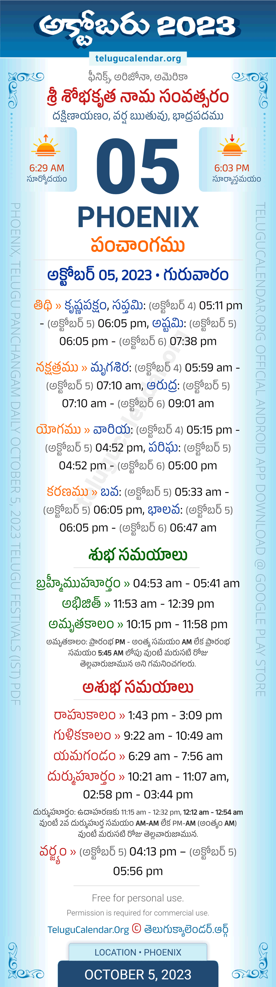 Download » October 5, 2023 » Phoenix (USA) Telugu Panchangam Daily Sheet with Auspicious and Inauspicious Timings.