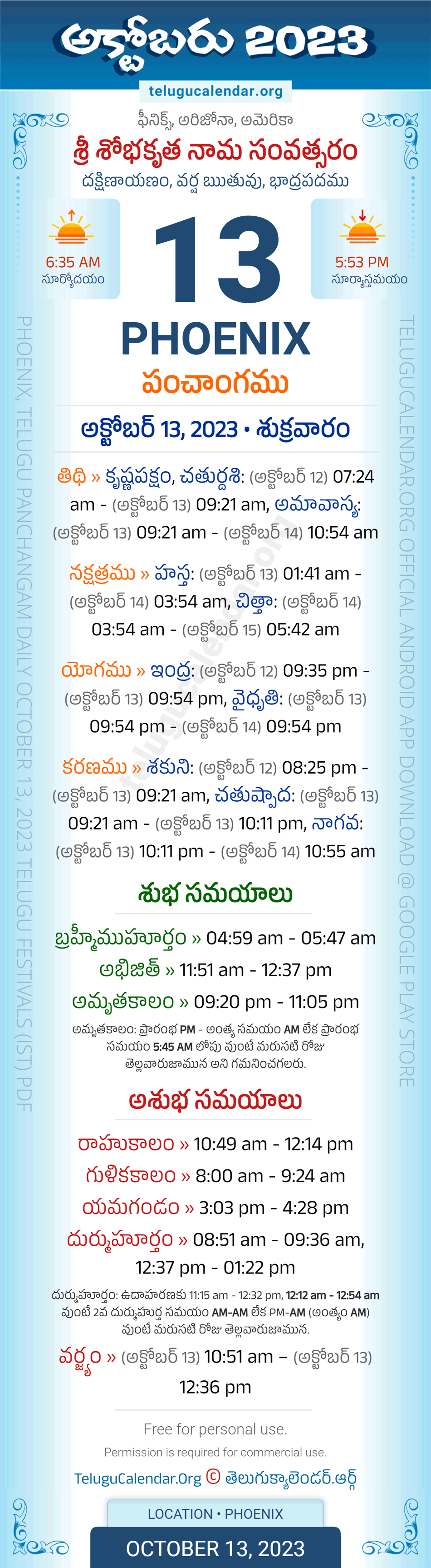 Download » October 13, 2023 » Phoenix (USA) Telugu Panchangam Daily Sheet with Auspicious and Inauspicious Timings.