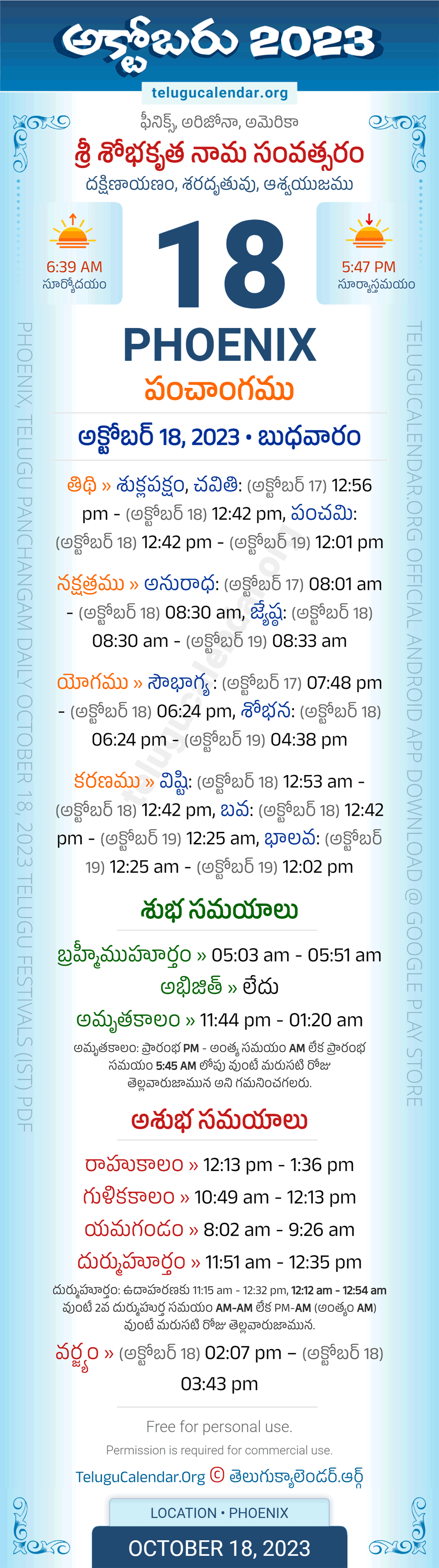 Download » October 18, 2023 » Phoenix (USA) Telugu Panchangam Daily Sheet with Auspicious and Inauspicious Timings.