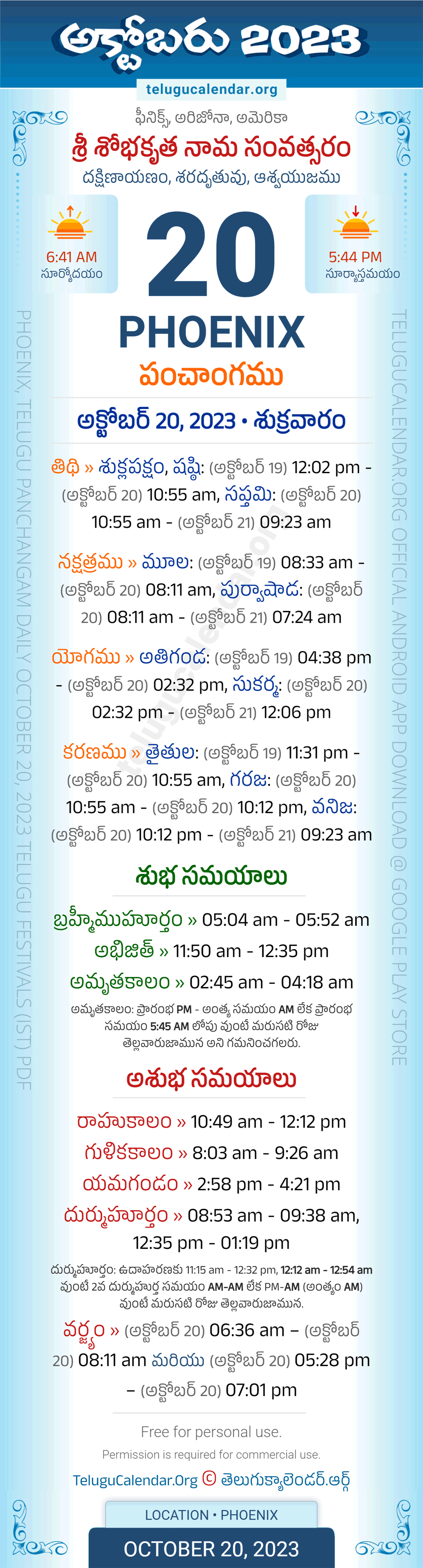 Download » October 20, 2023 » Phoenix (USA) Telugu Panchangam Daily Sheet with Auspicious and Inauspicious Timings.