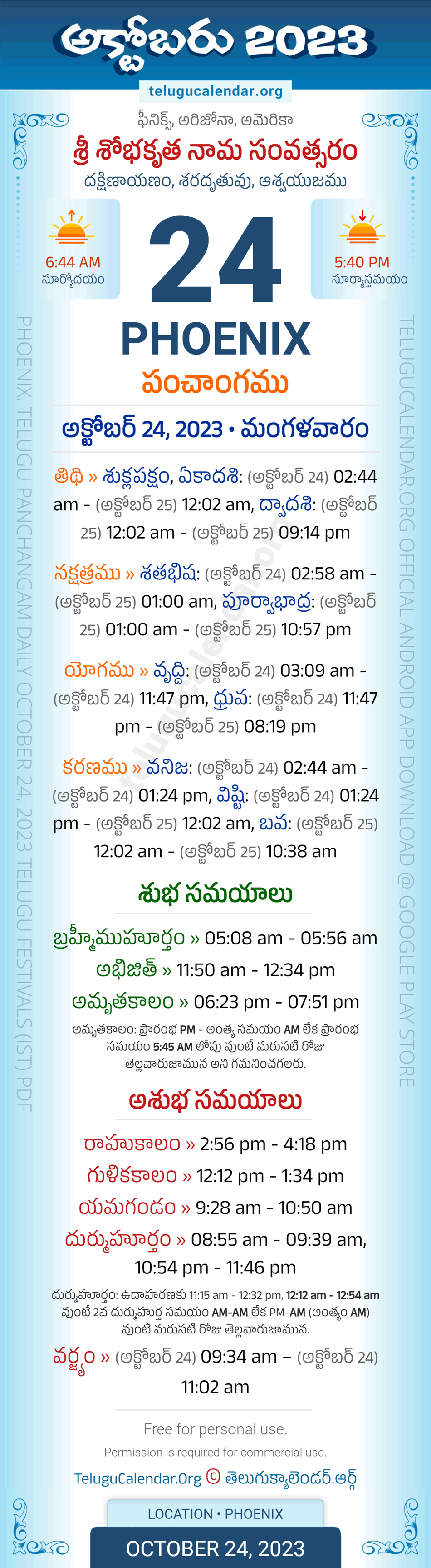 Phoenix Panchangam October 24, 2023 Daily Sheet in Telugu... Phoenix Telugu Panchangam Tuesday, October 24, 2023, Today's Phoenix Tithi: Sukla Paksham, Ekadashi: (Oct 24) 02:44 am - (Oct 25) 12:02 am, Dwadasi: (Oct 25) 12:02 am - (Oct 25) 09:14 pm, Today's Phoenix Nakshatram: Shathabhisha: (Oct 24) 02:58 am - (Oct 25) 01:00 am, Purva Bhadrapada: (Oct 25) 01:00 am - (Oct 25) 10:57 pm, Telugu Year: Sri Sobhakritu Nama Samvatsaram, Vedic Aayana: Dakshinayanam, Vedic Rutuvu: Sharad, Chandramasa (Amanta): Ashwayujamu. Below image showing information about the 5 attributes of the day, viz., Varam, Tithi, Nakshatram, Yogam & Karanam along with starting and end timings. Read more
