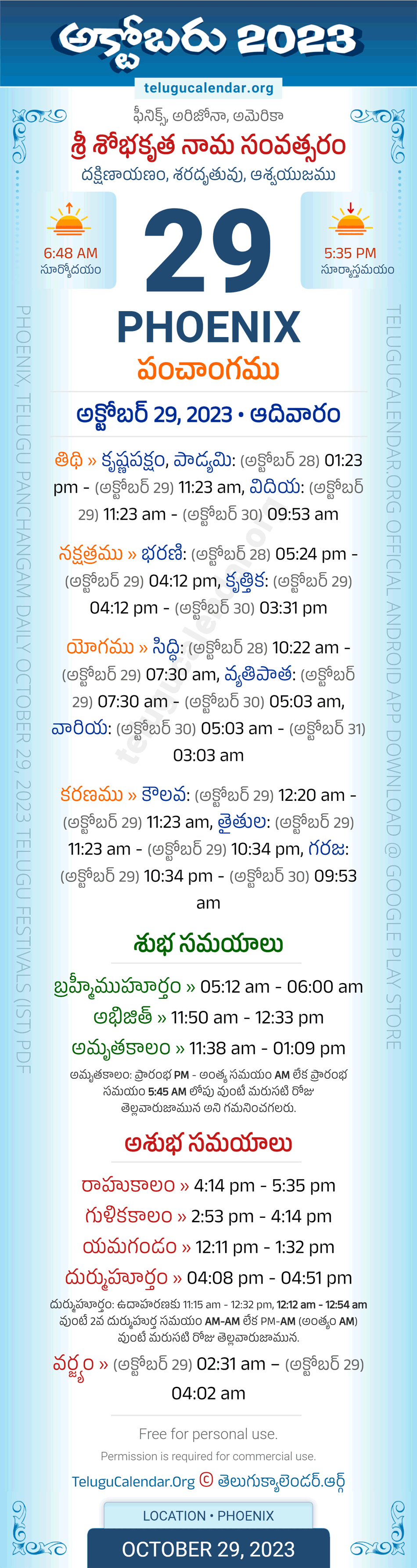 Download » October 29, 2023 » Phoenix (USA) Telugu Panchangam Daily Sheet with Auspicious and Inauspicious Timings.