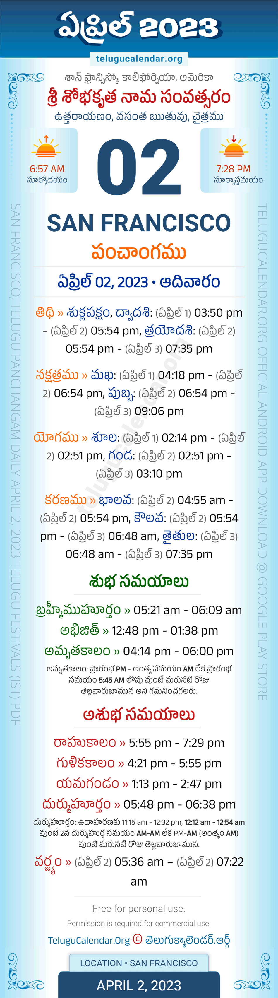 Apart from the Panchangam April 2, 2023 San Francisco Telugu Calendar Daily Sheet, you can also find the Sunrise and Sunset (Middle Limb) timings, Paksham, Telugu Year, Yanam, Rutuvu, Telugu Month. Today's San Francisco Auspicious Timings April 2, 2023 (Shubha Muhuratam Today Good Timings like Abhijit Muhurtham, Amruta Kalam & Brahma Muhurtham) and Today's San Francisco Inauspicious Timings April 2, 2023 (Bad Timings like Durmuhurtham, Rahukalam, Gulika kalam & Yamagandam) with starting and end timings in the above image.