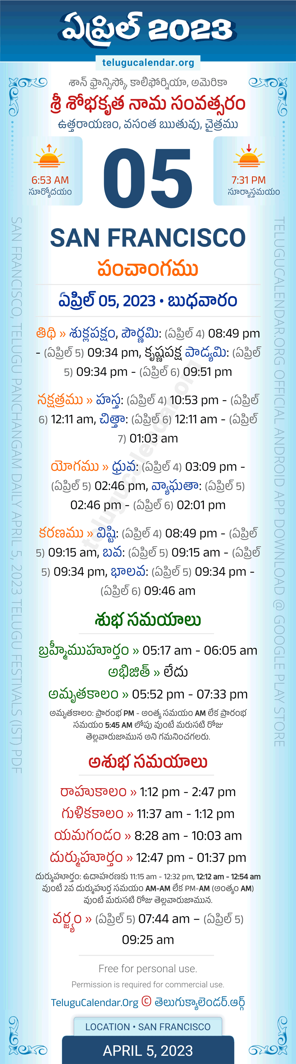 Download » April 5, 2023 » San Francisco (USA) Telugu Panchangam Daily Sheet with Auspicious and Inauspicious Timings.