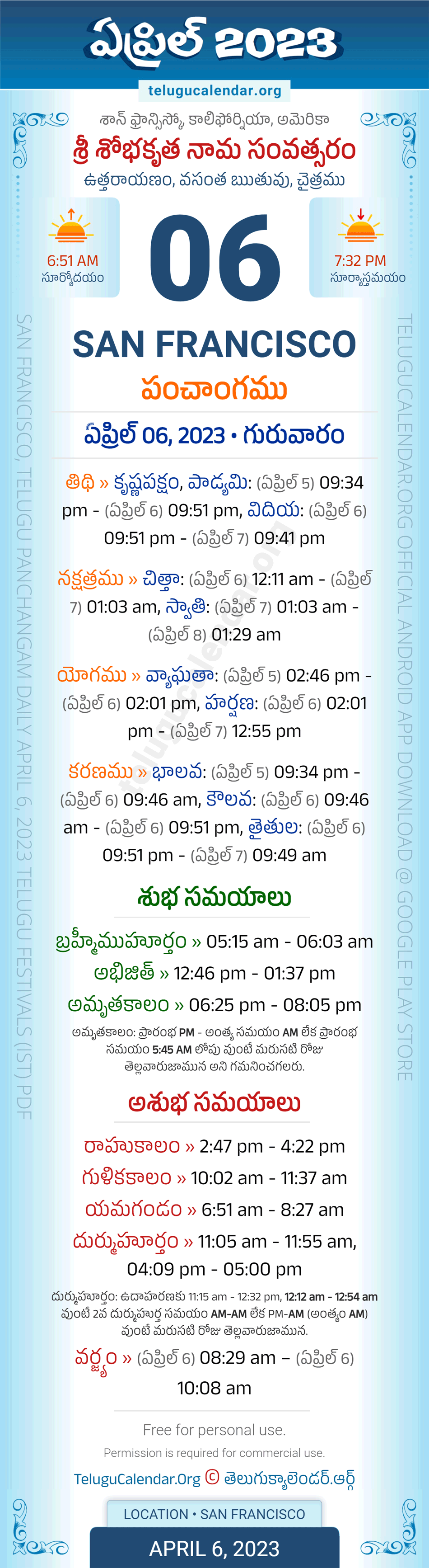 Apart from the Panchangam April 6, 2023 San Francisco Telugu Calendar Daily Sheet, you can also find the Sunrise and Sunset (Middle Limb) timings, Paksham, Telugu Year, Yanam, Rutuvu, Telugu Month. Today's San Francisco Auspicious Timings April 6, 2023 (Shubha Muhuratam Today Good Timings like Abhijit Muhurtham, Amruta Kalam & Brahma Muhurtham) and Today's San Francisco Inauspicious Timings April 6, 2023 (Bad Timings like Durmuhurtham, Rahukalam, Gulika kalam & Yamagandam) with starting and end timings in the above image.