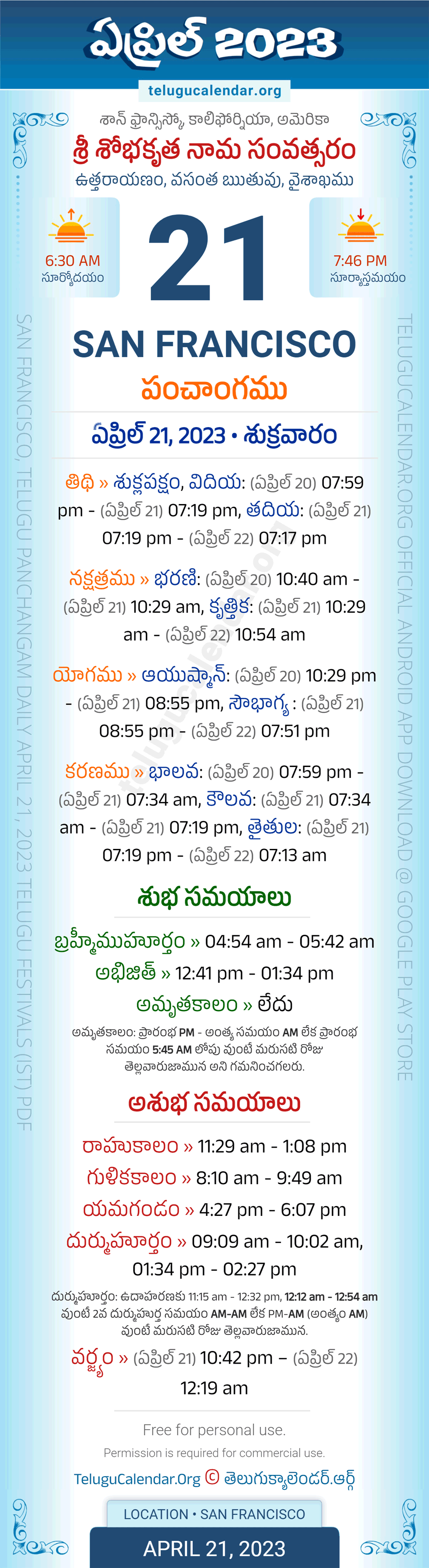 Apart from the Panchangam April 21, 2023 San Francisco Telugu Calendar Daily Sheet, you can also find the Sunrise and Sunset (Middle Limb) timings, Paksham, Telugu Year, Yanam, Rutuvu, Telugu Month. Today's San Francisco Auspicious Timings April 21, 2023 (Shubha Muhuratam Today Good Timings like Abhijit Muhurtham, Amruta Kalam & Brahma Muhurtham) and Today's San Francisco Inauspicious Timings April 21, 2023 (Bad Timings like Durmuhurtham, Rahukalam, Gulika kalam & Yamagandam) with starting and end timings in the above image.