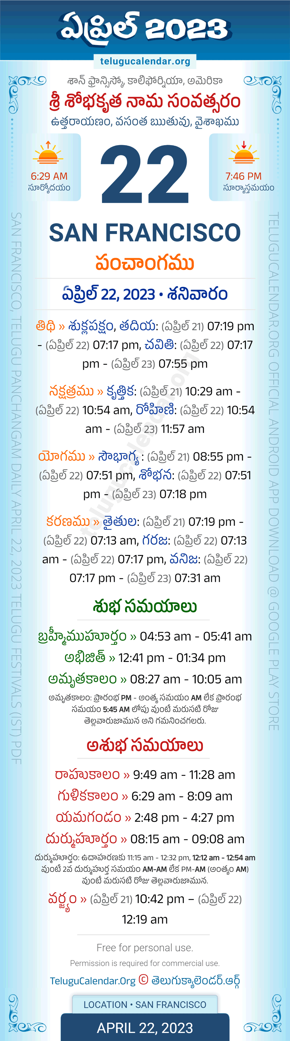 Apart from the Panchangam April 22, 2023 San Francisco Telugu Calendar Daily Sheet, you can also find the Sunrise and Sunset (Middle Limb) timings, Paksham, Telugu Year, Yanam, Rutuvu, Telugu Month. Today's San Francisco Auspicious Timings April 22, 2023 (Shubha Muhuratam Today Good Timings like Abhijit Muhurtham, Amruta Kalam & Brahma Muhurtham) and Today's San Francisco Inauspicious Timings April 22, 2023 (Bad Timings like Durmuhurtham, Rahukalam, Gulika kalam & Yamagandam) with starting and end timings in the above image.