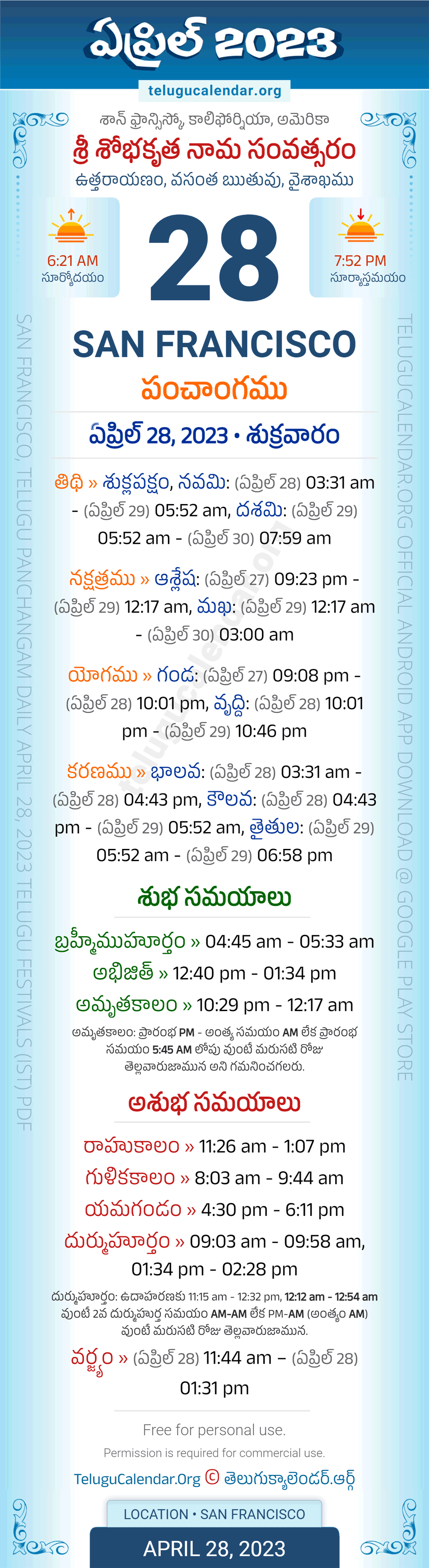 Download » April 28, 2023 » San Francisco (USA) Telugu Panchangam Daily Sheet with Auspicious and Inauspicious Timings.