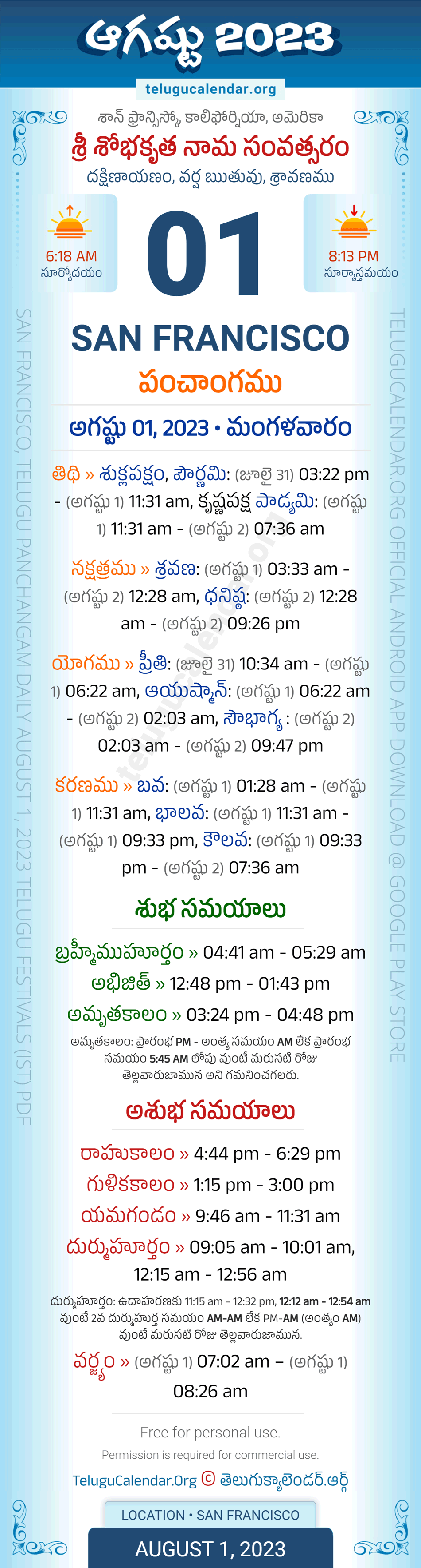 Download » August 1, 2023 » San Francisco (USA) Telugu Panchangam Daily Sheet with Auspicious and Inauspicious Timings.