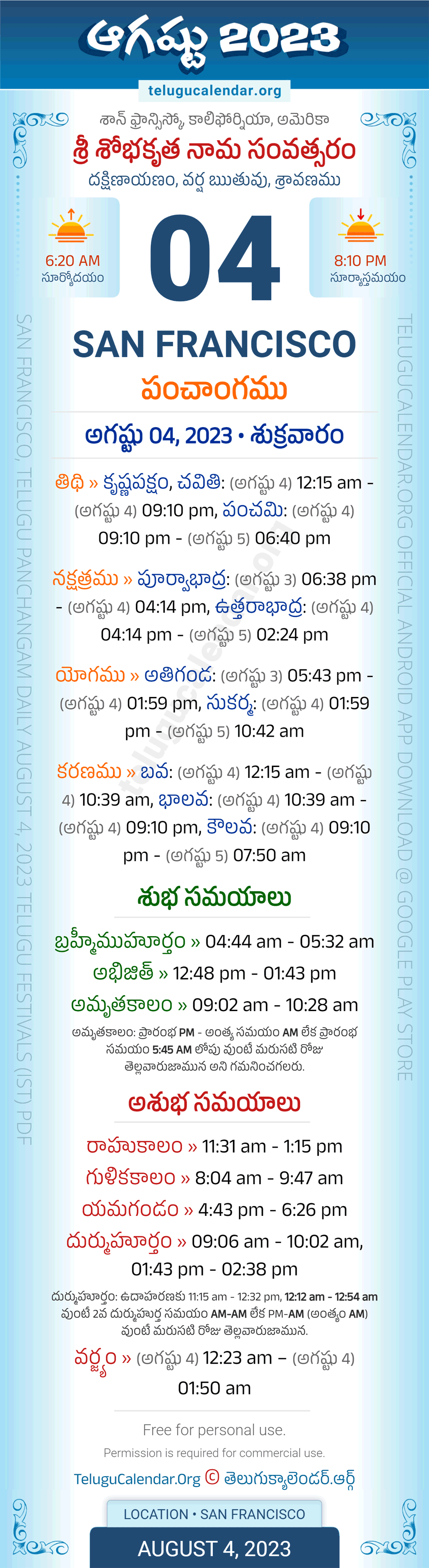 Download » August 4, 2023 » San Francisco (USA) Telugu Panchangam Daily Sheet with Auspicious and Inauspicious Timings.