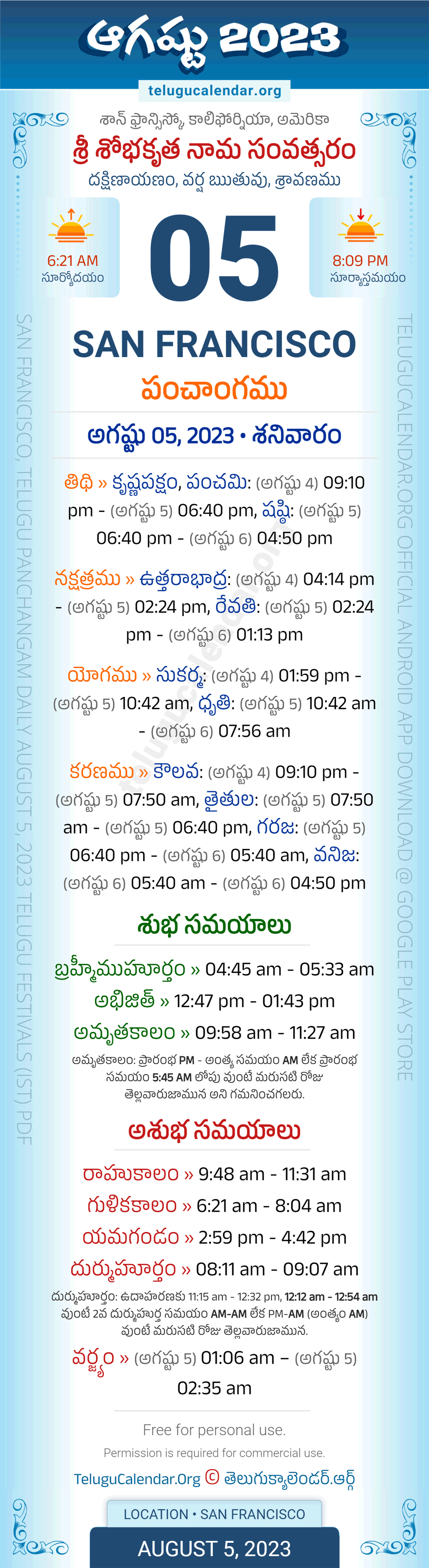 Download » August 5, 2023 » San Francisco (USA) Telugu Panchangam Daily Sheet with Auspicious and Inauspicious Timings.