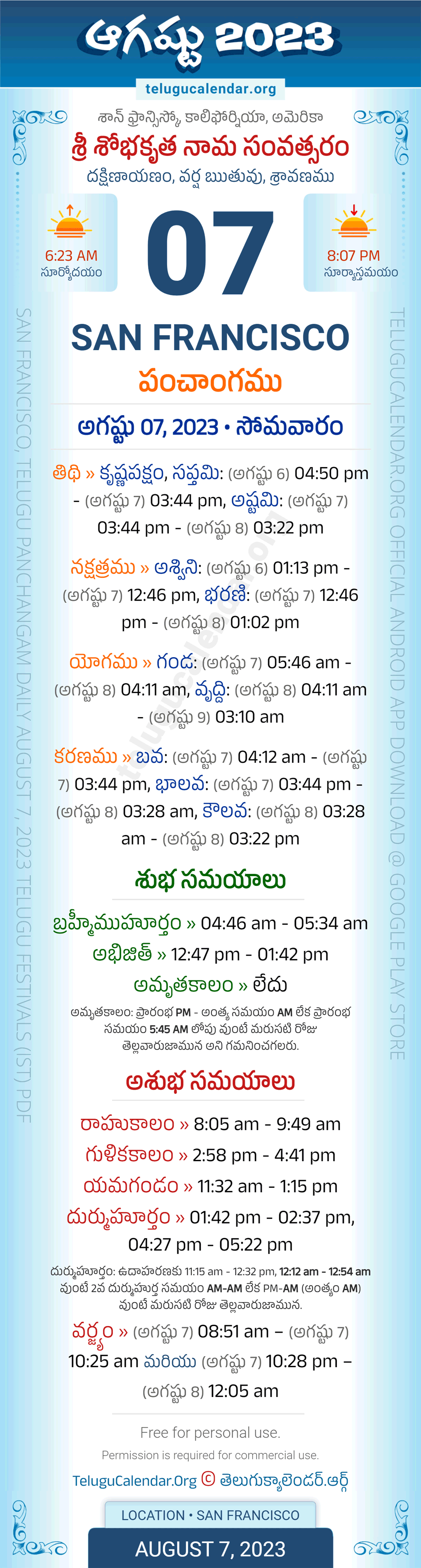 Download » August 7, 2023 » San Francisco (USA) Telugu Panchangam Daily Sheet with Auspicious and Inauspicious Timings.