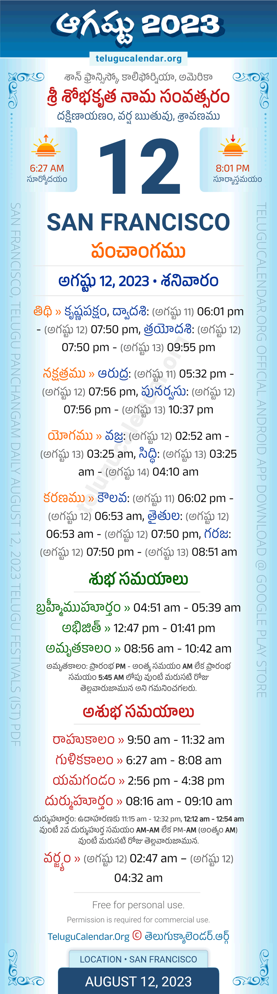 Apart from the Panchangam August 12, 2023 San Francisco Telugu Calendar Daily Sheet, you can also find the Sunrise and Sunset (Middle Limb) timings, Paksham, Telugu Year, Yanam, Rutuvu, Telugu Month. Today's San Francisco Auspicious Timings August 12, 2023 (Shubha Muhuratam Today Good Timings like Abhijit Muhurtham, Amruta Kalam & Brahma Muhurtham) and Today's San Francisco Inauspicious Timings August 12, 2023 (Bad Timings like Durmuhurtham, Rahukalam, Gulika kalam & Yamagandam) with starting and end timings in the above image.
