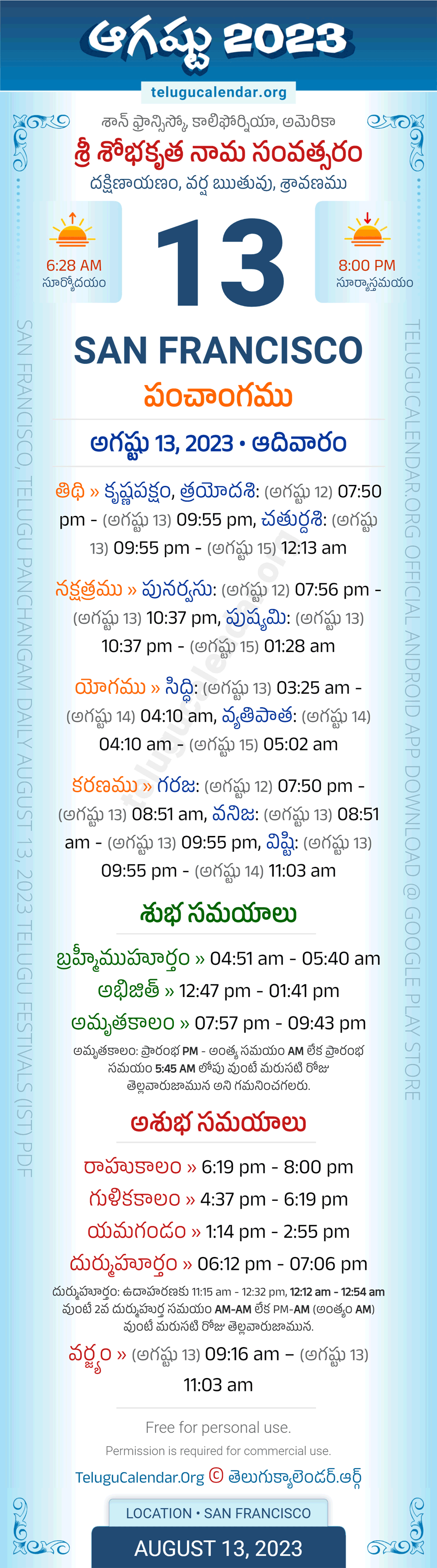 Download » August 13, 2023 » San Francisco (USA) Telugu Panchangam Daily Sheet with Auspicious and Inauspicious Timings.