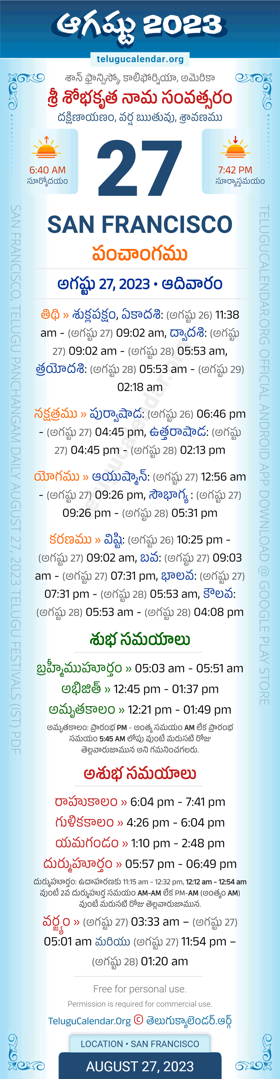 Apart from the Panchangam August 27, 2023 San Francisco Telugu Calendar Daily Sheet, you can also find the Sunrise and Sunset (Middle Limb) timings, Paksham, Telugu Year, Yanam, Rutuvu, Telugu Month. Today's San Francisco Auspicious Timings August 27, 2023 (Shubha Muhuratam Today Good Timings like Abhijit Muhurtham, Amruta Kalam & Brahma Muhurtham) and Today's San Francisco Inauspicious Timings August 27, 2023 (Bad Timings like Durmuhurtham, Rahukalam, Gulika kalam & Yamagandam) with starting and end timings in the above image.