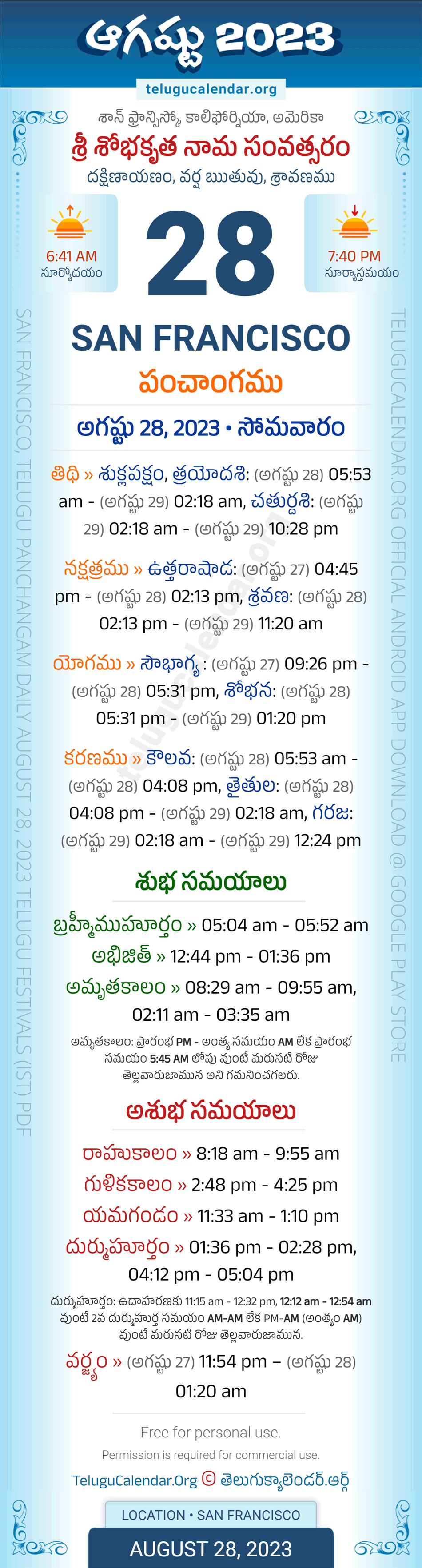 Apart from the Panchangam August 28, 2023 San Francisco Telugu Calendar Daily Sheet, you can also find the Sunrise and Sunset (Middle Limb) timings, Paksham, Telugu Year, Yanam, Rutuvu, Telugu Month. Today's San Francisco Auspicious Timings August 28, 2023 (Shubha Muhuratam Today Good Timings like Abhijit Muhurtham, Amruta Kalam & Brahma Muhurtham) and Today's San Francisco Inauspicious Timings August 28, 2023 (Bad Timings like Durmuhurtham, Rahukalam, Gulika kalam & Yamagandam) with starting and end timings in the above image.