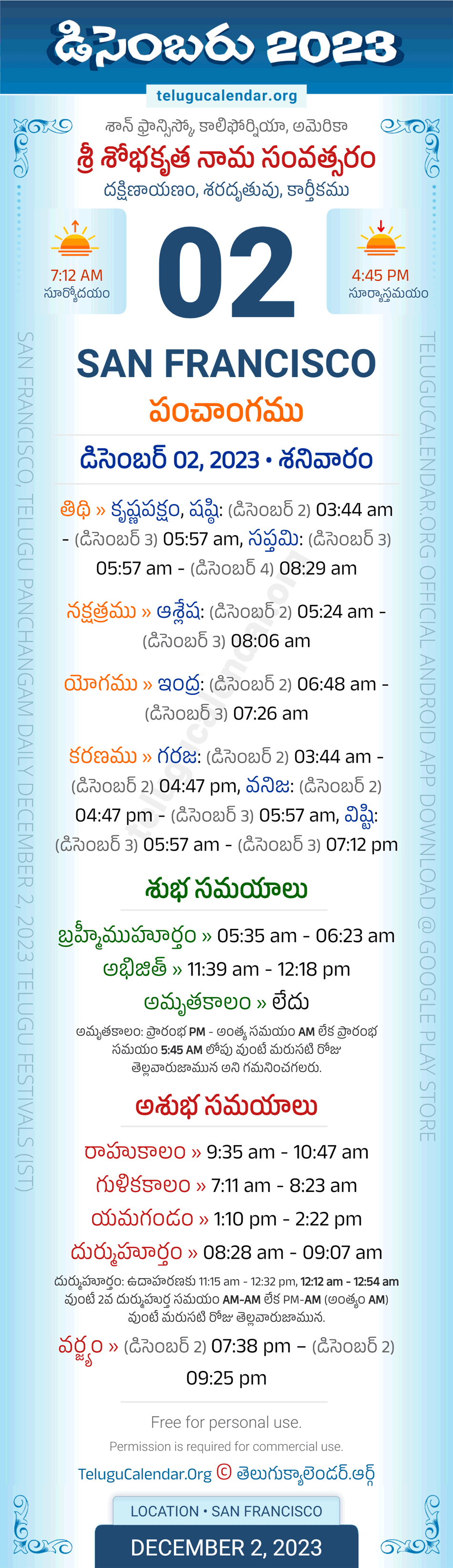 Download » December 2, 2023 » San Francisco (USA) Telugu Panchangam Daily Sheet with Auspicious and Inauspicious Timings.