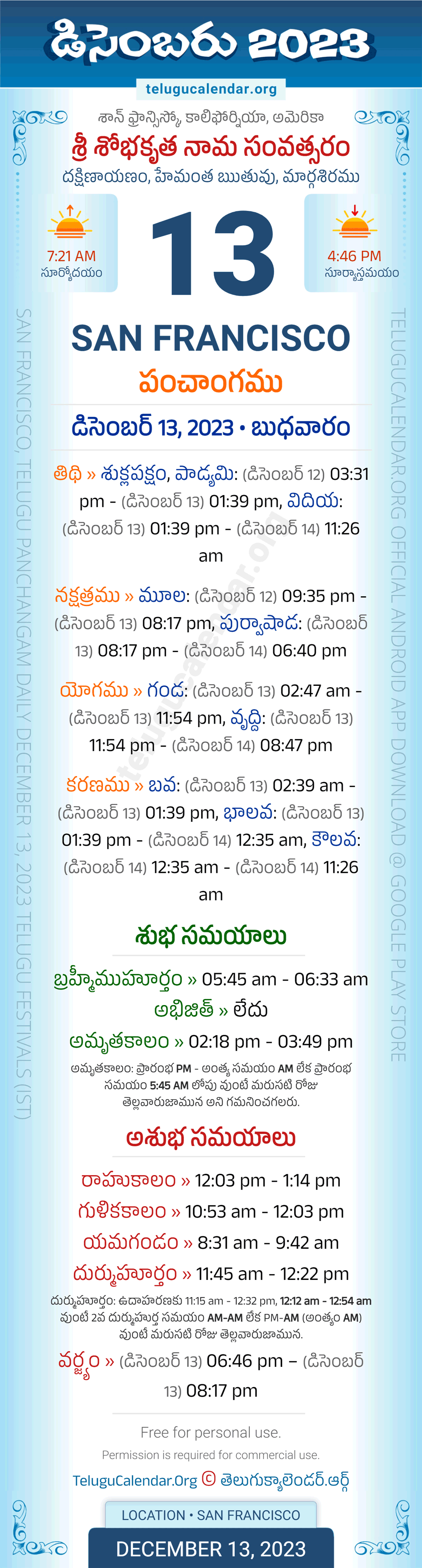 San Francisco Panchangam December 13, 2023 Daily Sheet in Telugu... San Francisco Telugu Panchangam Wednesday, December 13, 2023, Today's San Francisco Tithi: Sukla Paksham, Padyami: (Dec 12) 03:31 pm - (Dec 13) 01:39 pm, Vidiya: (Dec 13) 01:39 pm - (Dec 14) 11:26 am, Today's San Francisco Nakshatram: Moola: (Dec 12) 09:35 pm - (Dec 13) 08:17 pm, Purva Ashadha: (Dec 13) 08:17 pm - (Dec 14) 06:40 pm, Telugu Year: Sri Sobhakritu Nama Samvatsaram, Vedic Aayana: Dakshinayanam, Vedic Rutuvu: Hemanta, Chandramasa (Amanta): Margasiramu. Below image showing information about the 5 attributes of the day, viz., Varam, Tithi, Nakshatram, Yogam & Karanam along with starting and end timings. Read more