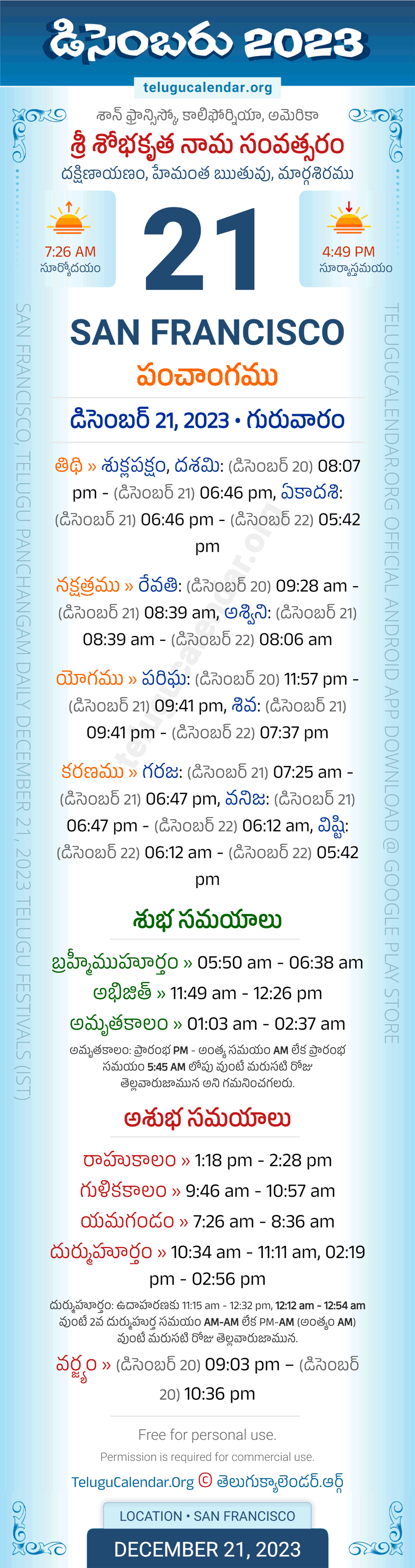 Apart from the Panchangam December 21, 2023 San Francisco Telugu Calendar Daily Sheet, you can also find the Sunrise and Sunset (Middle Limb) timings, Paksham, Telugu Year, Yanam, Rutuvu, Telugu Month. Today's San Francisco Auspicious Timings December 21, 2023 (Shubha Muhuratam Today Good Timings like Abhijit Muhurtham, Amruta Kalam & Brahma Muhurtham) and Today's San Francisco Inauspicious Timings December 21, 2023 (Bad Timings like Durmuhurtham, Rahukalam, Gulika kalam & Yamagandam) with starting and end timings in the above image.