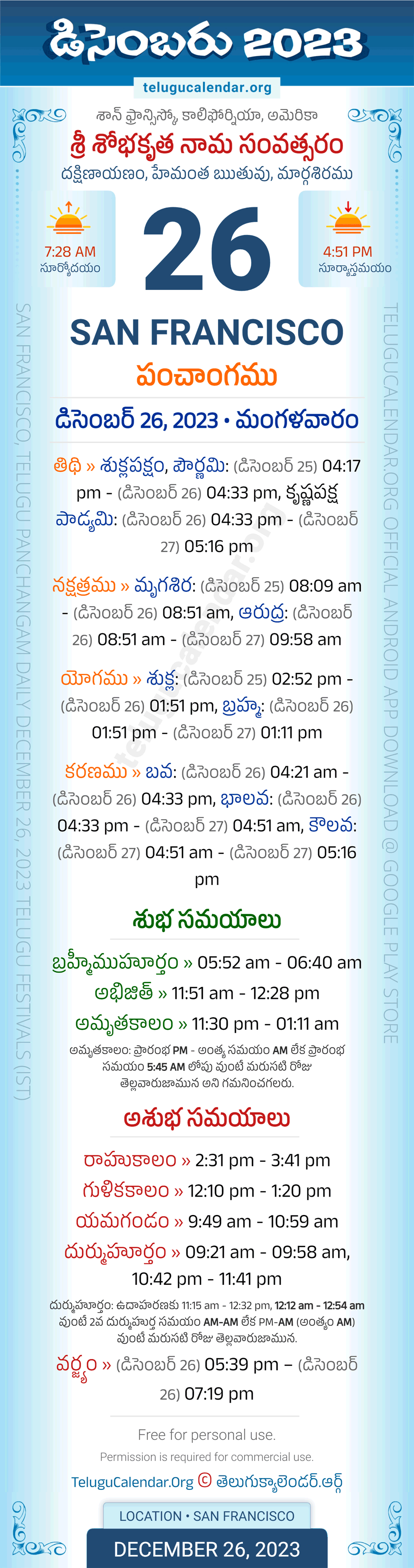 San Francisco Panchangam December 26, 2023 Daily Sheet in Telugu... San Francisco Telugu Panchangam Tuesday, December 26, 2023, Today's San Francisco Tithi: Sukla Paksham, Pournami: (Dec 25) 04:17 pm - (Dec 26) 04:33 pm, Krishna Paksha Padyami: (Dec 26) 04:33 pm - (Dec 27) 05:16 pm, Today's San Francisco Nakshatram: Mrigasira: (Dec 25) 08:09 am - (Dec 26) 08:51 am, Arudra: (Dec 26) 08:51 am - (Dec 27) 09:58 am, Telugu Year: Sri Sobhakritu Nama Samvatsaram, Vedic Aayana: Dakshinayanam, Vedic Rutuvu: Hemanta, Chandramasa (Amanta): Margasiramu. Below image showing information about the 5 attributes of the day, viz., Varam, Tithi, Nakshatram, Yogam & Karanam along with starting and end timings. Read more