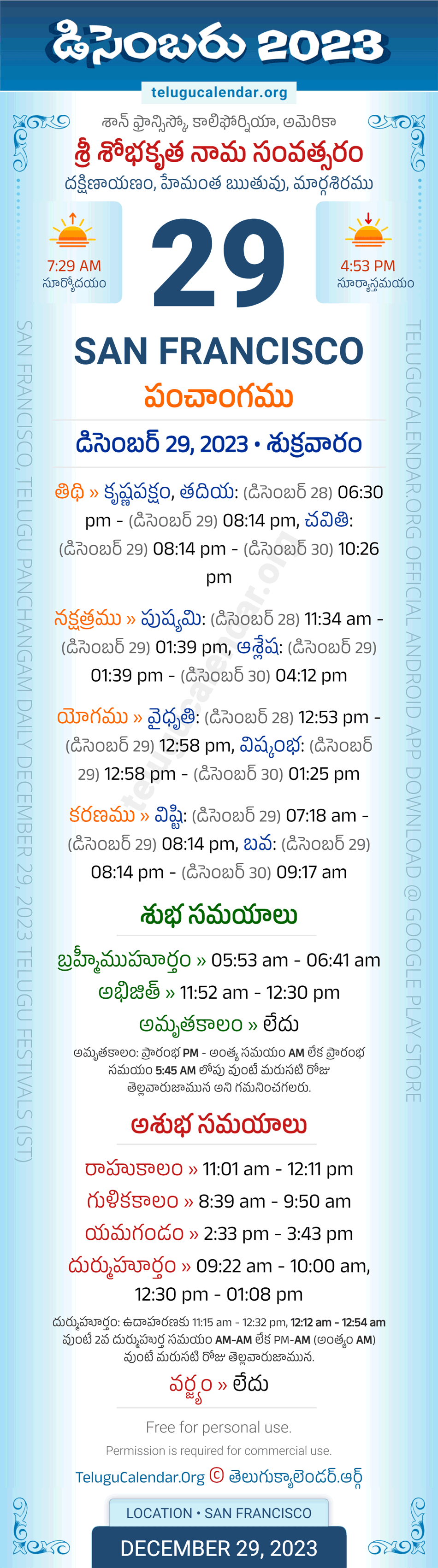 Apart from the Panchangam December 29, 2023 San Francisco Telugu Calendar Daily Sheet, you can also find the Sunrise and Sunset (Middle Limb) timings, Paksham, Telugu Year, Yanam, Rutuvu, Telugu Month. Today's San Francisco Auspicious Timings December 29, 2023 (Shubha Muhuratam Today Good Timings like Abhijit Muhurtham, Amruta Kalam & Brahma Muhurtham) and Today's San Francisco Inauspicious Timings December 29, 2023 (Bad Timings like Durmuhurtham, Rahukalam, Gulika kalam & Yamagandam) with starting and end timings in the above image.