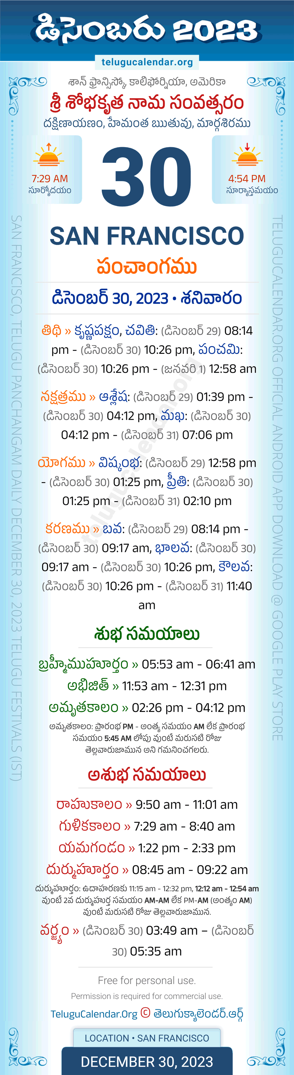 Download » December 30, 2023 » San Francisco (USA) Telugu Panchangam Daily Sheet with Auspicious and Inauspicious Timings.