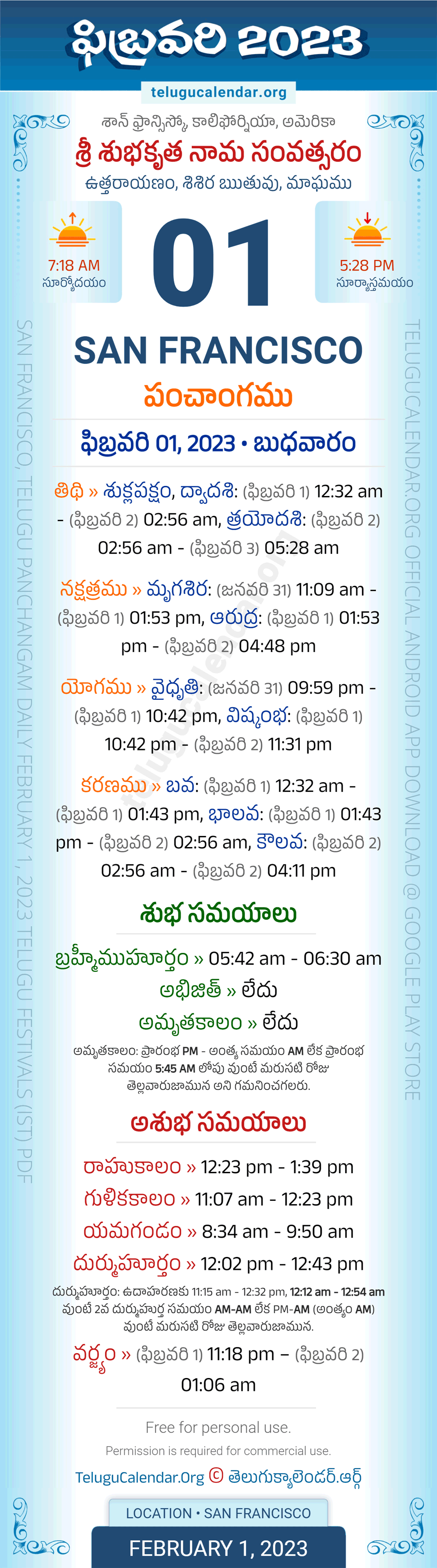 Download » February 1, 2023 » San Francisco (USA) Telugu Panchangam Daily Sheet with Auspicious and Inauspicious Timings.