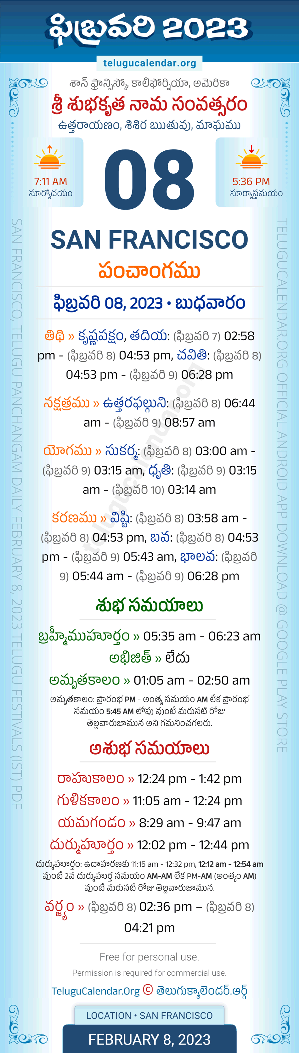 Download » February 8, 2023 » San Francisco (USA) Telugu Panchangam Daily Sheet with Auspicious and Inauspicious Timings.