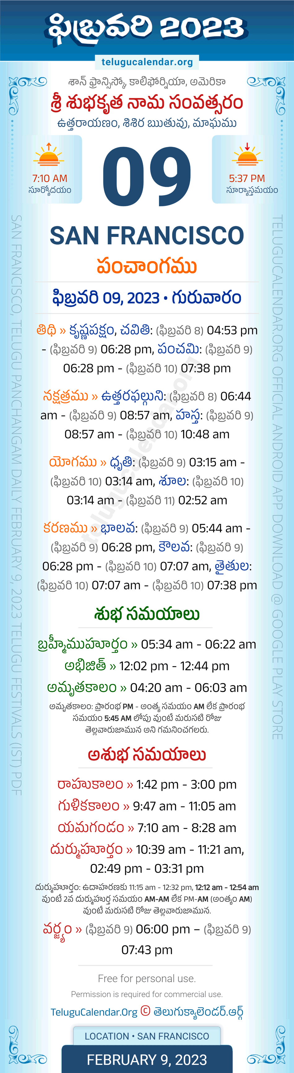 Download » February 9, 2023 » San Francisco (USA) Telugu Panchangam Daily Sheet with Auspicious and Inauspicious Timings.