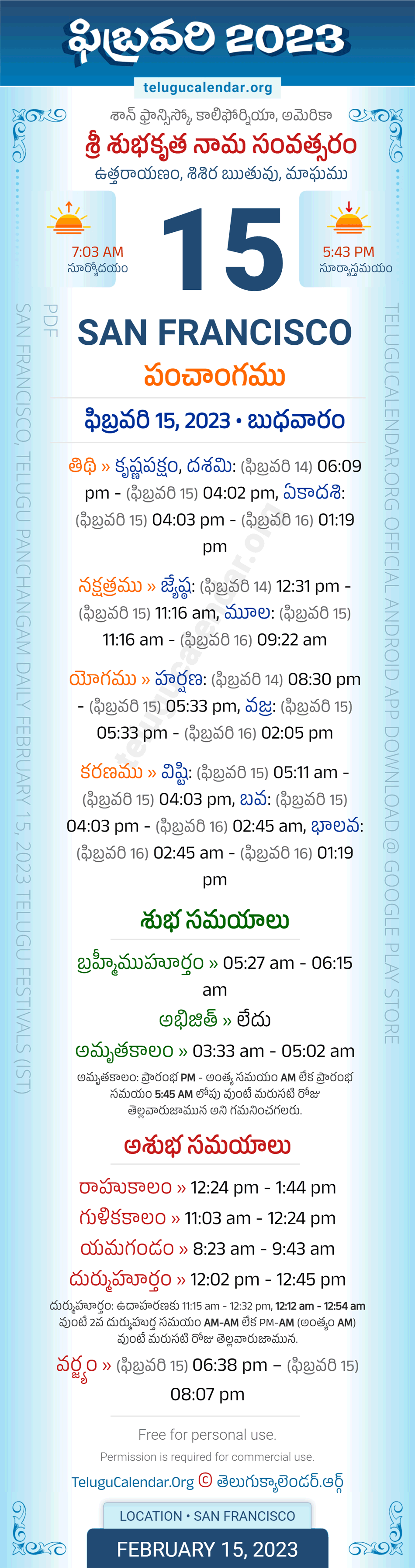 Download » February 15, 2023 » San Francisco (USA) Telugu Panchangam Daily Sheet with Auspicious and Inauspicious Timings.