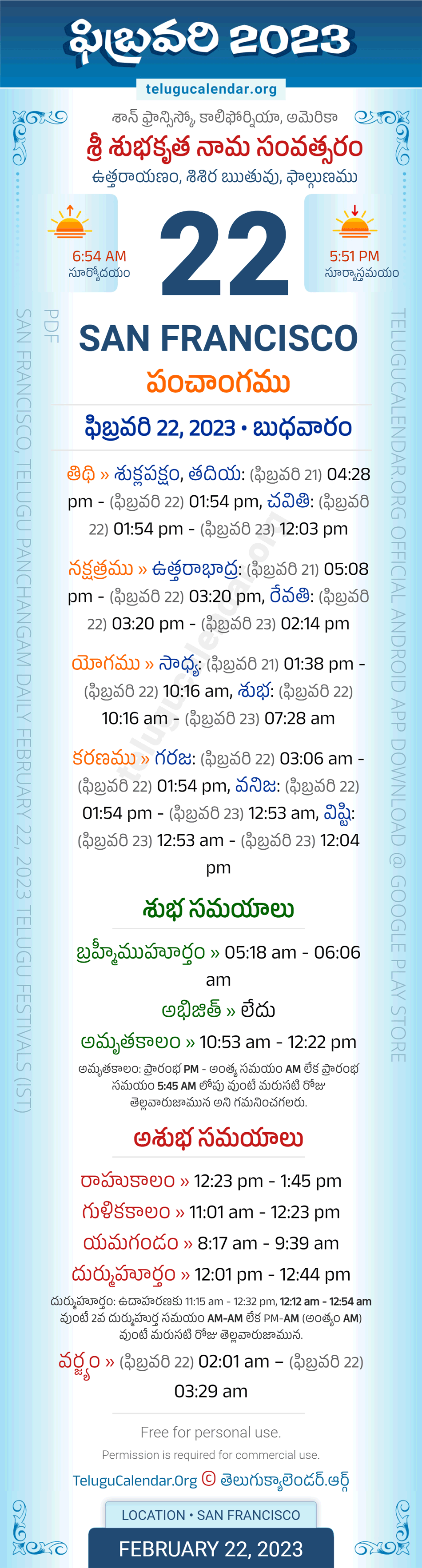 Download » February 22, 2023 » San Francisco (USA) Telugu Panchangam Daily Sheet with Auspicious and Inauspicious Timings.