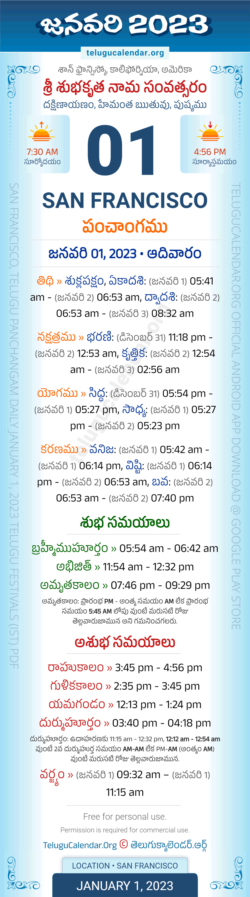 Download » January 1, 2023 » San Francisco (USA) Telugu Panchangam Daily Sheet with Auspicious and Inauspicious Timings.