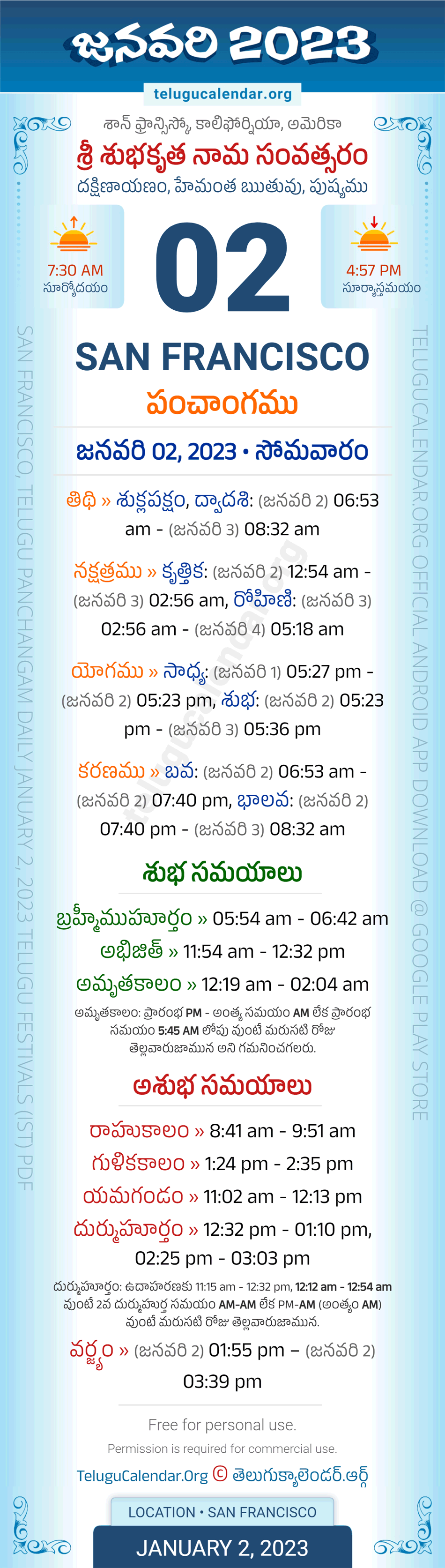 Download » January 2, 2023 » San Francisco (USA) Telugu Panchangam Daily Sheet with Auspicious and Inauspicious Timings.
