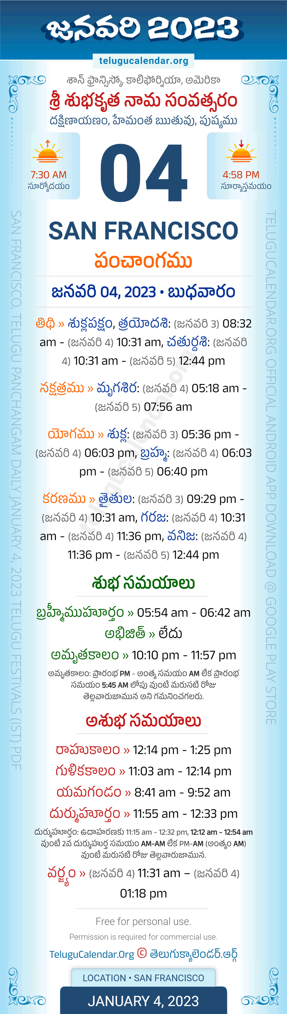 Download » January 4, 2023 » San Francisco (USA) Telugu Panchangam Daily Sheet with Auspicious and Inauspicious Timings.