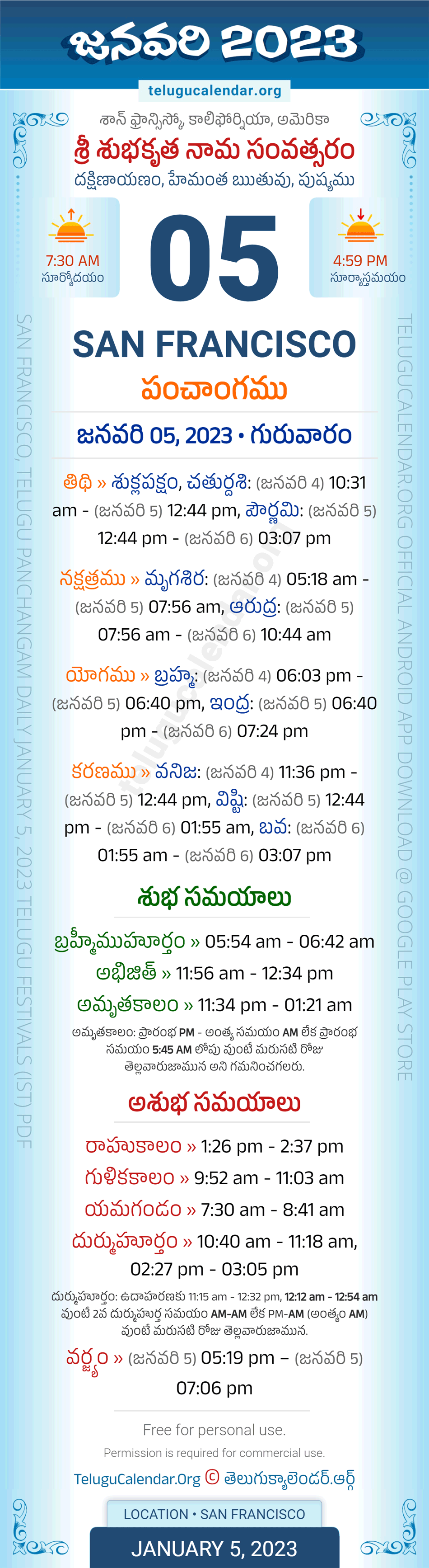 Apart from the Panchangam January 5, 2023 San Francisco Telugu Calendar Daily Sheet, you can also find the Sunrise and Sunset (Middle Limb) timings, Paksham, Telugu Year, Yanam, Rutuvu, Telugu Month. Today's San Francisco Auspicious Timings January 5, 2023 (Shubha Muhuratam Today Good Timings like Abhijit Muhurtham, Amruta Kalam & Brahma Muhurtham) and Today's San Francisco Inauspicious Timings January 5, 2023 (Bad Timings like Durmuhurtham, Rahukalam, Gulika kalam & Yamagandam) with starting and end timings in the above image.