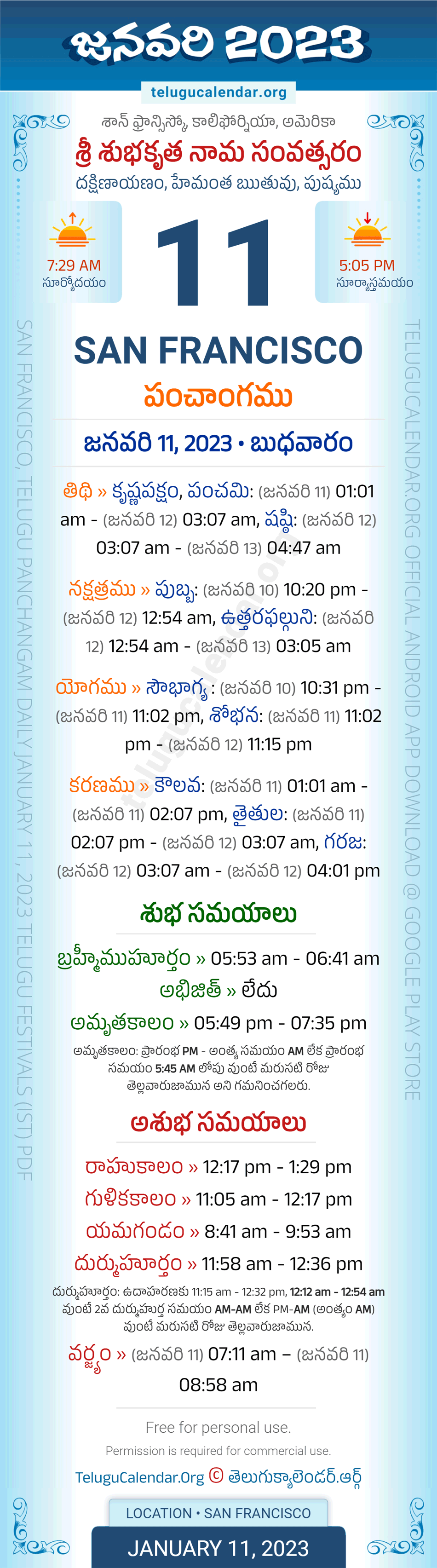 Download » January 11, 2023 » San Francisco (USA) Telugu Panchangam Daily Sheet with Auspicious and Inauspicious Timings.