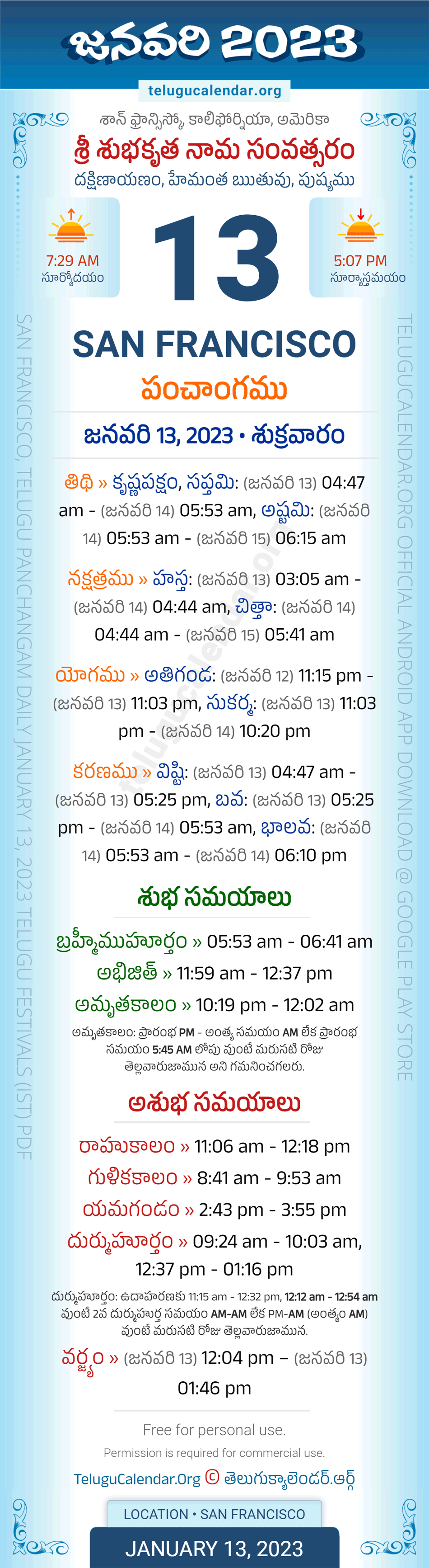 Apart from the Panchangam January 13, 2023 San Francisco Telugu Calendar Daily Sheet, you can also find the Sunrise and Sunset (Middle Limb) timings, Paksham, Telugu Year, Yanam, Rutuvu, Telugu Month. Today's San Francisco Auspicious Timings January 13, 2023 (Shubha Muhuratam Today Good Timings like Abhijit Muhurtham, Amruta Kalam & Brahma Muhurtham) and Today's San Francisco Inauspicious Timings January 13, 2023 (Bad Timings like Durmuhurtham, Rahukalam, Gulika kalam & Yamagandam) with starting and end timings in the above image.