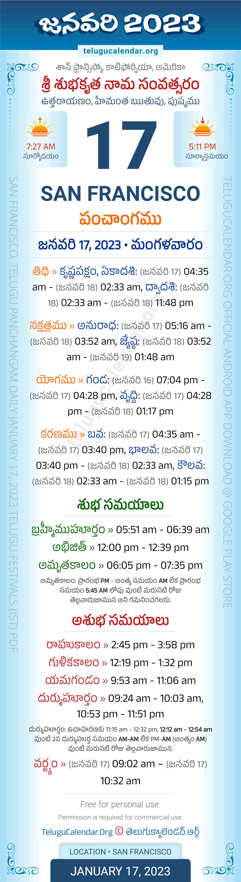 Download » January 17, 2023 » San Francisco (USA) Telugu Panchangam Daily Sheet with Auspicious and Inauspicious Timings.