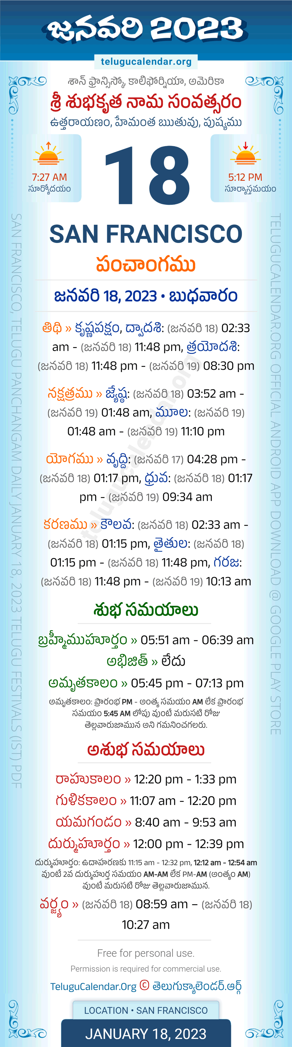 Apart from the Panchangam January 18, 2023 San Francisco Telugu Calendar Daily Sheet, you can also find the Sunrise and Sunset (Middle Limb) timings, Paksham, Telugu Year, Yanam, Rutuvu, Telugu Month. Today's San Francisco Auspicious Timings January 18, 2023 (Shubha Muhuratam Today Good Timings like Abhijit Muhurtham, Amruta Kalam & Brahma Muhurtham) and Today's San Francisco Inauspicious Timings January 18, 2023 (Bad Timings like Durmuhurtham, Rahukalam, Gulika kalam & Yamagandam) with starting and end timings in the above image.