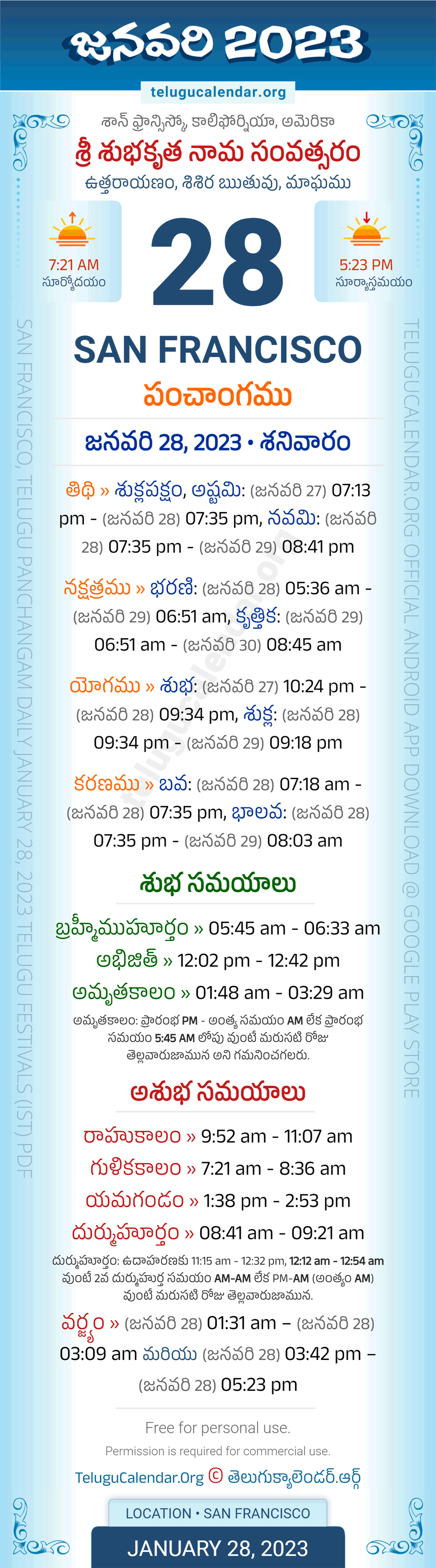 Download » January 28, 2023 » San Francisco (USA) Telugu Panchangam Daily Sheet with Auspicious and Inauspicious Timings.