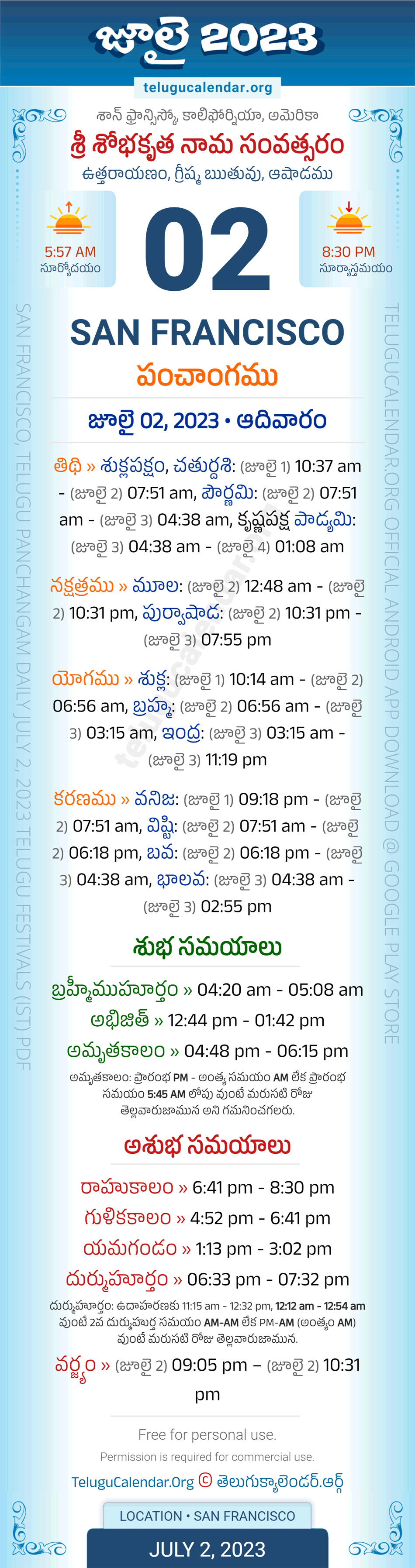 San Francisco Panchangam July 2, 2023 Daily Sheet in Telugu... San Francisco Telugu Panchangam Sunday, July 02, 2023, Today's San Francisco Tithi: Sukla Paksham, Chaturdashi: (Jul 1) 10:37 am - (Jul 2) 07:51 am, Pournami: (Jul 2) 07:51 am - (Jul 3) 04:38 am, Krishna Paksha Padyami: (Jul 3) 04:38 am - (Jul 4) 01:08 am, Today's San Francisco Nakshatram: Moola: (Jul 2) 12:48 am - (Jul 2) 10:31 pm, Purva Ashadha: (Jul 2) 10:31 pm - (Jul 3) 07:55 pm, Telugu Year: Sri Sobhakritu Nama Samvatsaram, Vedic Aayana: Uttarayanam, Vedic Rutuvu: Grishma, Chandramasa (Amanta): Ashadhamu. Below image showing information about the 5 attributes of the day, viz., Varam, Tithi, Nakshatram, Yogam & Karanam along with starting and end timings. Read more