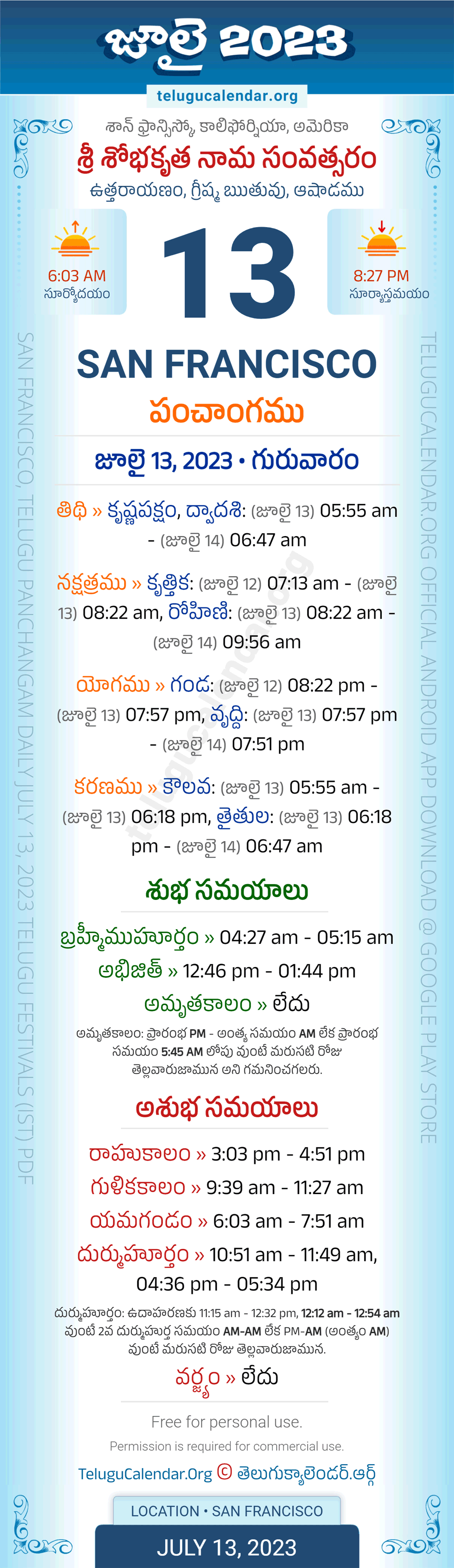Apart from the Panchangam July 13, 2023 San Francisco Telugu Calendar Daily Sheet, you can also find the Sunrise and Sunset (Middle Limb) timings, Paksham, Telugu Year, Yanam, Rutuvu, Telugu Month. Today's San Francisco Auspicious Timings July 13, 2023 (Shubha Muhuratam Today Good Timings like Abhijit Muhurtham, Amruta Kalam & Brahma Muhurtham) and Today's San Francisco Inauspicious Timings July 13, 2023 (Bad Timings like Durmuhurtham, Rahukalam, Gulika kalam & Yamagandam) with starting and end timings in the above image.