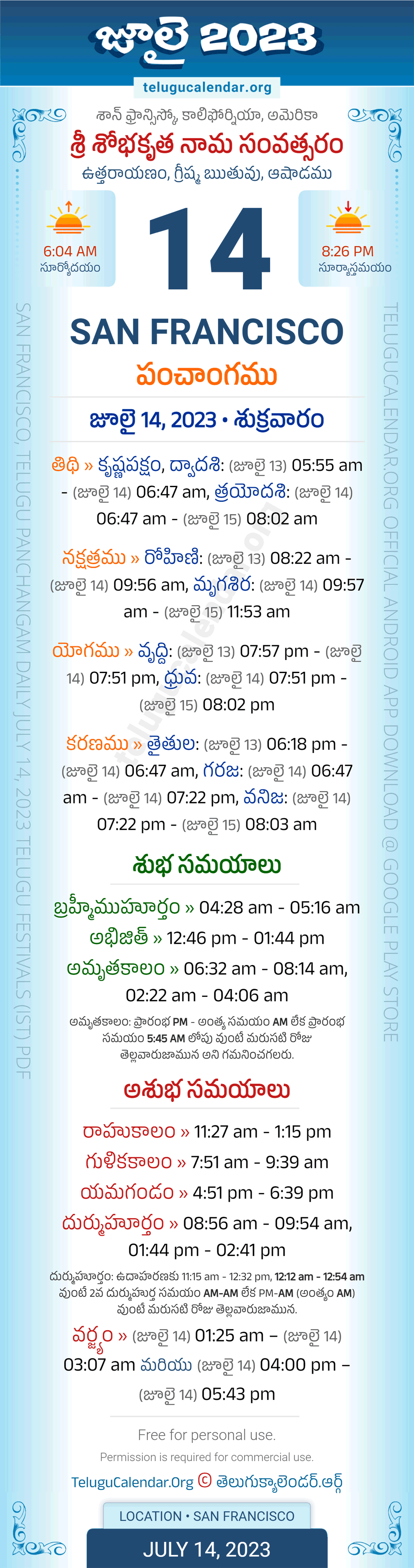 Download » July 14, 2023 » San Francisco (USA) Telugu Panchangam Daily Sheet with Auspicious and Inauspicious Timings.