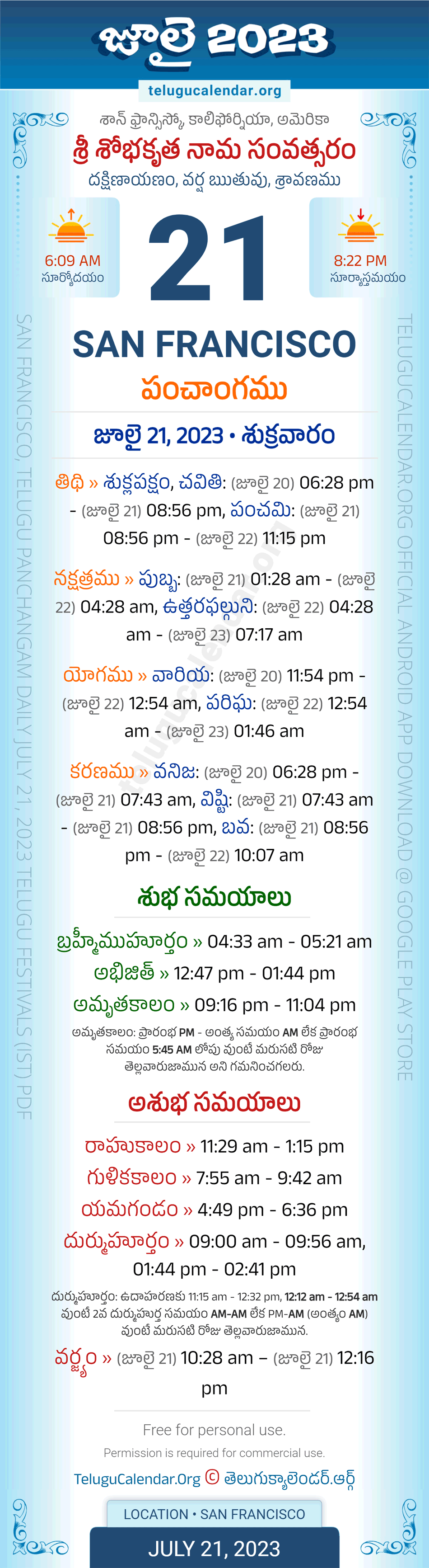 Apart from the Panchangam July 21, 2023 San Francisco Telugu Calendar Daily Sheet, you can also find the Sunrise and Sunset (Middle Limb) timings, Paksham, Telugu Year, Yanam, Rutuvu, Telugu Month. Today's San Francisco Auspicious Timings July 21, 2023 (Shubha Muhuratam Today Good Timings like Abhijit Muhurtham, Amruta Kalam & Brahma Muhurtham) and Today's San Francisco Inauspicious Timings July 21, 2023 (Bad Timings like Durmuhurtham, Rahukalam, Gulika kalam & Yamagandam) with starting and end timings in the above image.