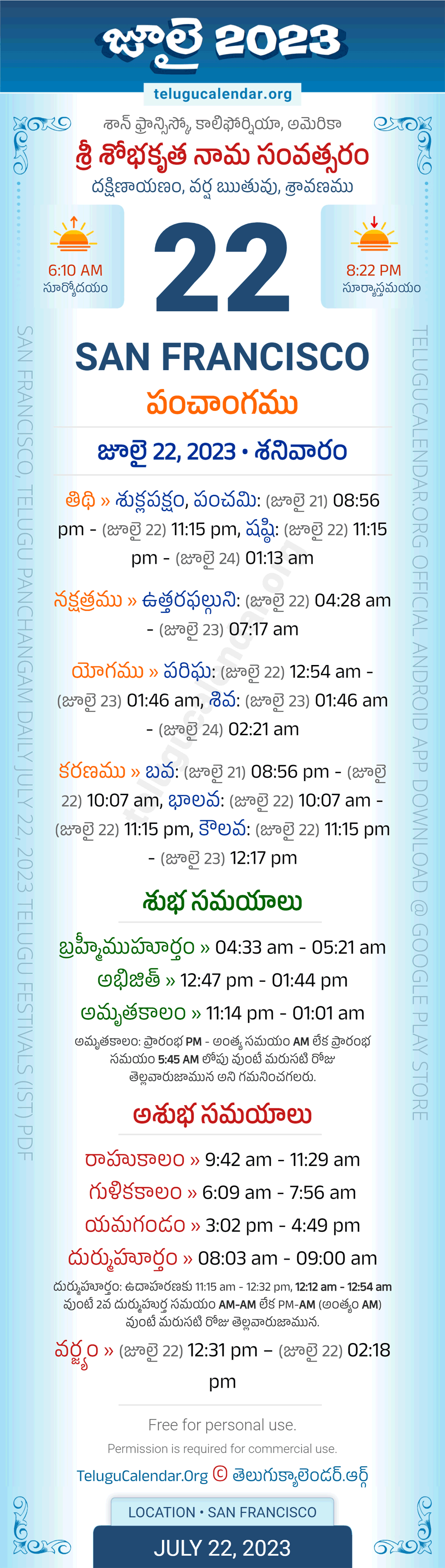 San Francisco Panchangam July 22, 2023 Daily Sheet in Telugu... San Francisco Telugu Panchangam Saturday, July 22, 2023, Today's San Francisco Tithi: Sukla Paksham, Panchami: (Jul 21) 08:56 pm - (Jul 22) 11:15 pm, Shashthi: (Jul 22) 11:15 pm - (Jul 24) 01:13 am, Today's San Francisco Nakshatram: Uttara Phalguni: (Jul 22) 04:28 am - (Jul 23) 07:17 am, Telugu Year: Sri Sobhakritu Nama Samvatsaram, Vedic Aayana: Dakshinayanam, Vedic Rutuvu: Varsha, Chandramasa (Amanta): Sravanamu. Below image showing information about the 5 attributes of the day, viz., Varam, Tithi, Nakshatram, Yogam & Karanam along with starting and end timings. Read more