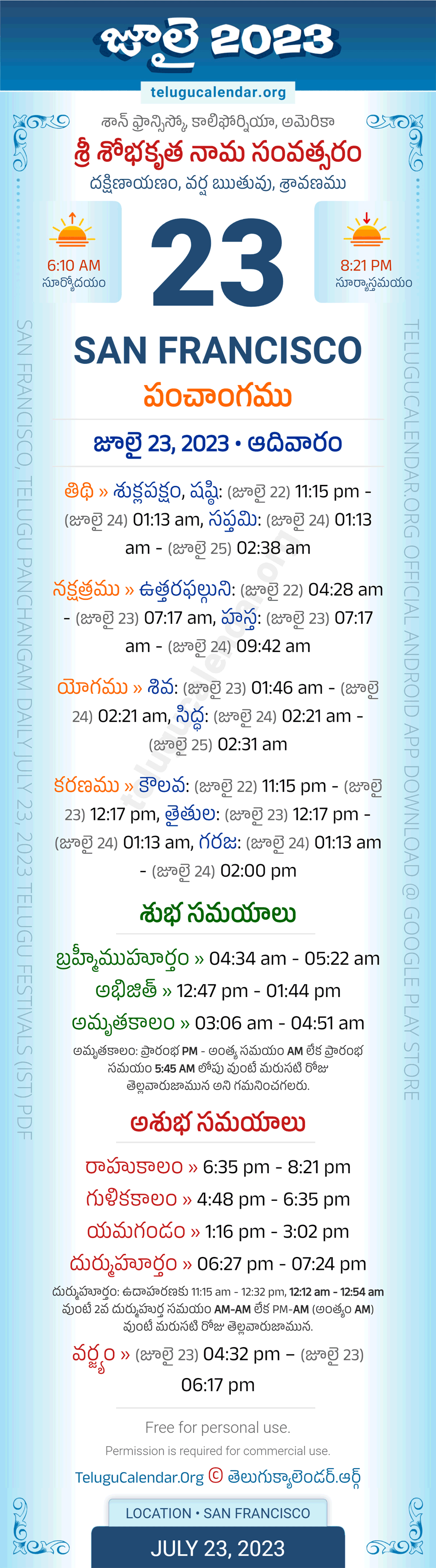Apart from the Panchangam July 23, 2023 San Francisco Telugu Calendar Daily Sheet, you can also find the Sunrise and Sunset (Middle Limb) timings, Paksham, Telugu Year, Yanam, Rutuvu, Telugu Month. Today's San Francisco Auspicious Timings July 23, 2023 (Shubha Muhuratam Today Good Timings like Abhijit Muhurtham, Amruta Kalam & Brahma Muhurtham) and Today's San Francisco Inauspicious Timings July 23, 2023 (Bad Timings like Durmuhurtham, Rahukalam, Gulika kalam & Yamagandam) with starting and end timings in the above image.