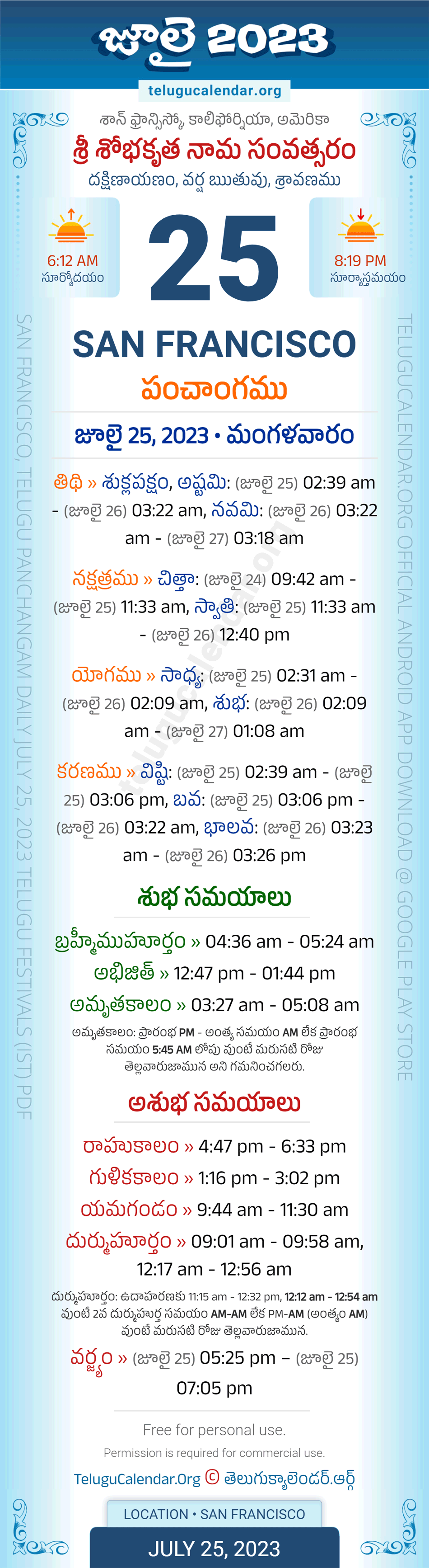 Apart from the Panchangam July 25, 2023 San Francisco Telugu Calendar Daily Sheet, you can also find the Sunrise and Sunset (Middle Limb) timings, Paksham, Telugu Year, Yanam, Rutuvu, Telugu Month. Today's San Francisco Auspicious Timings July 25, 2023 (Shubha Muhuratam Today Good Timings like Abhijit Muhurtham, Amruta Kalam & Brahma Muhurtham) and Today's San Francisco Inauspicious Timings July 25, 2023 (Bad Timings like Durmuhurtham, Rahukalam, Gulika kalam & Yamagandam) with starting and end timings in the above image.